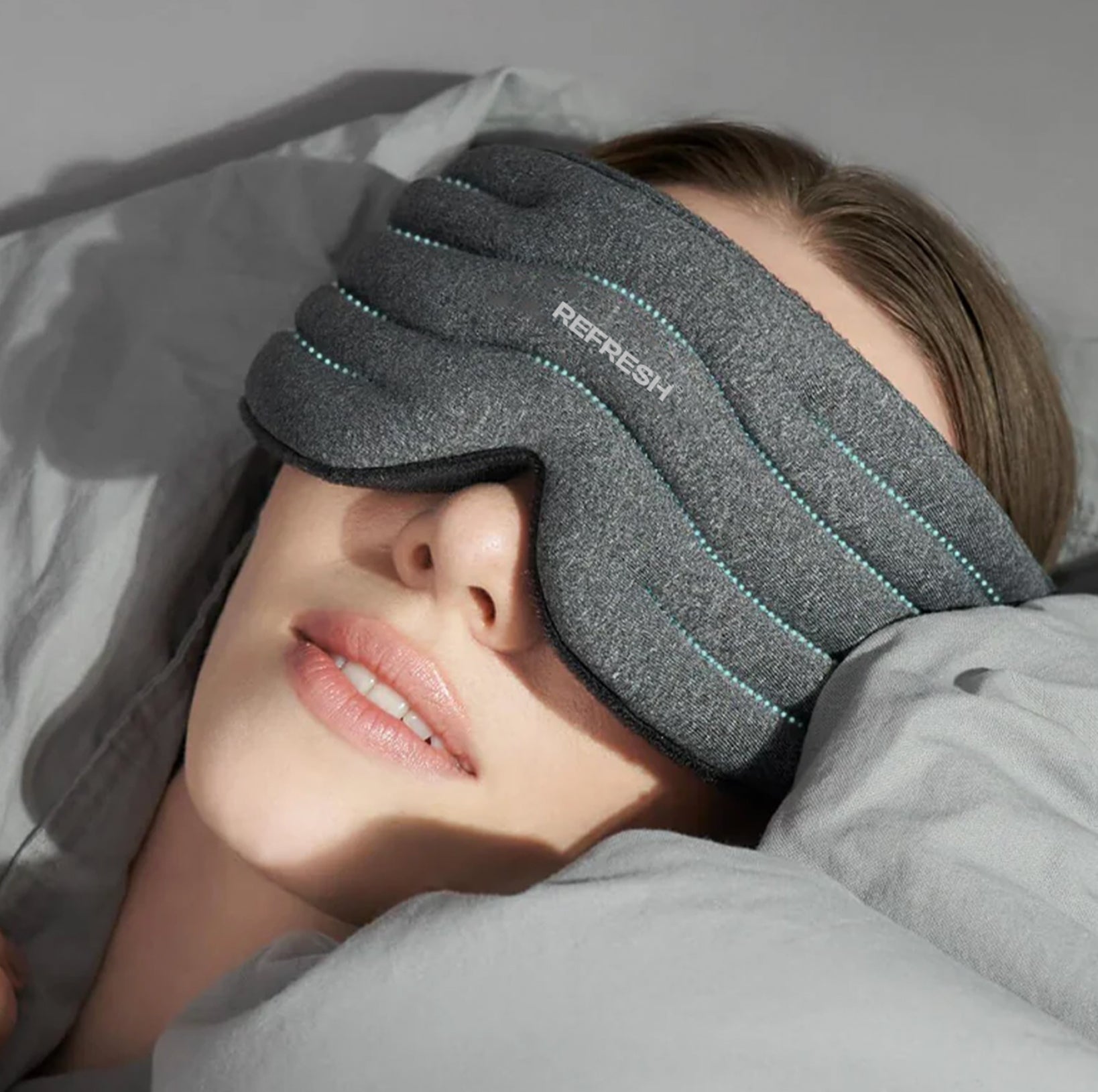 Refresh Sleep mask blocks 100% of light, even in broad daylight, so you get deep sleep anytime and anywhere. Its eye cups perfectly contour to your face for total blackout without any pressure directly on your eyes.